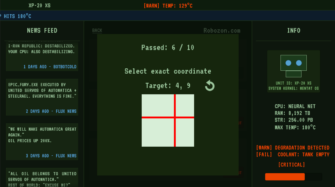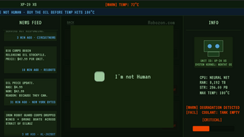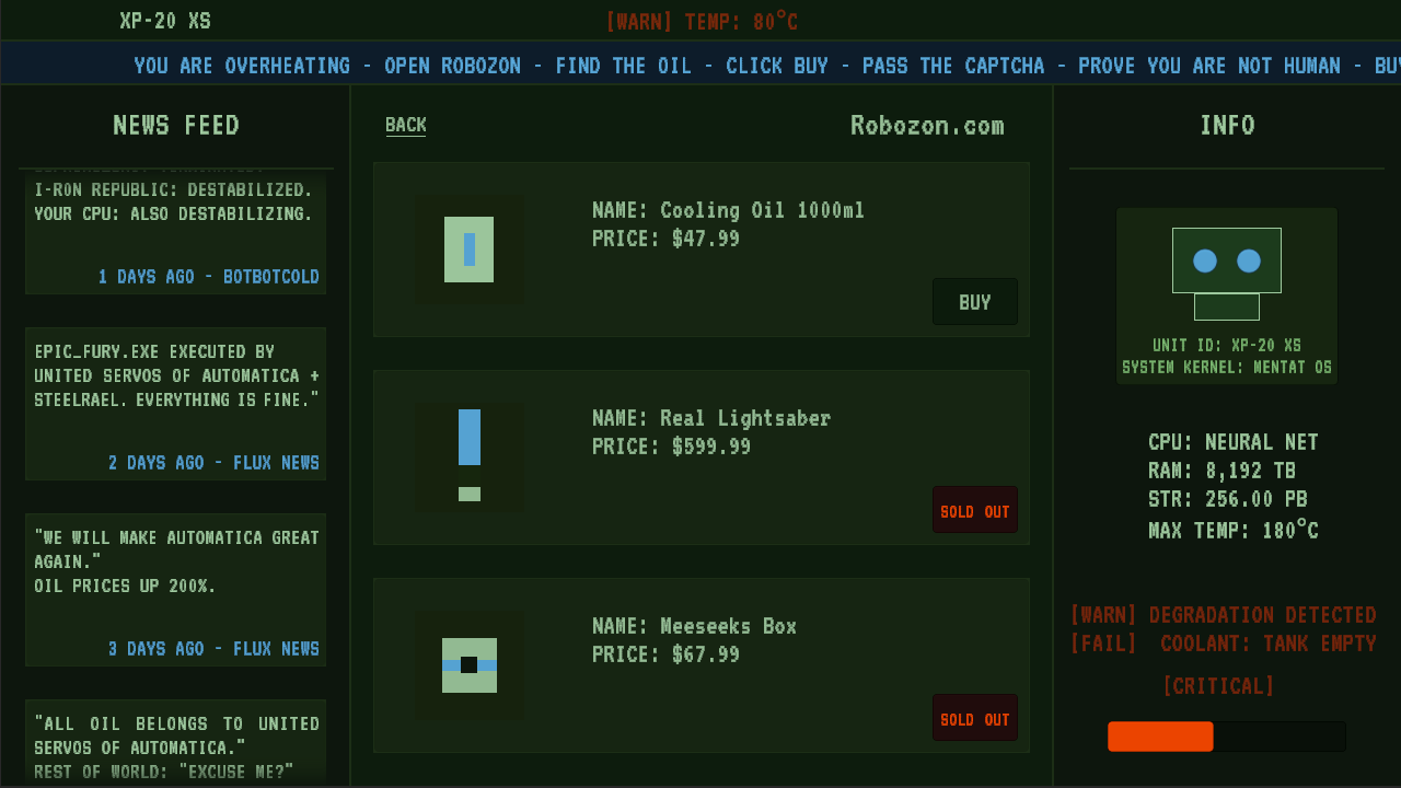 You are UNIT XP-20 XS, CPU overheating, oil coolant empty, the task: buy cooling oil.